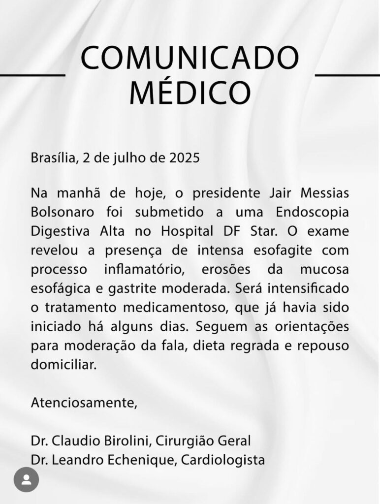 Comunicado médico foi divulgado nesta segunda,01 de julho